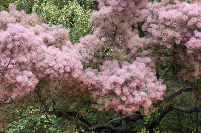Smoke trees captivate gardeners with their mesmerizing appearance, featuring delicate flower clusters that resemble ethereal pink wisps drifting above intricate branches.