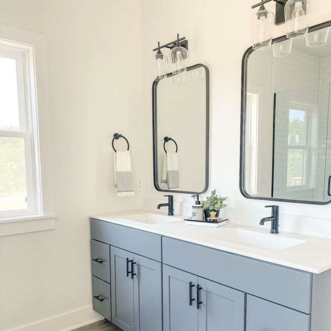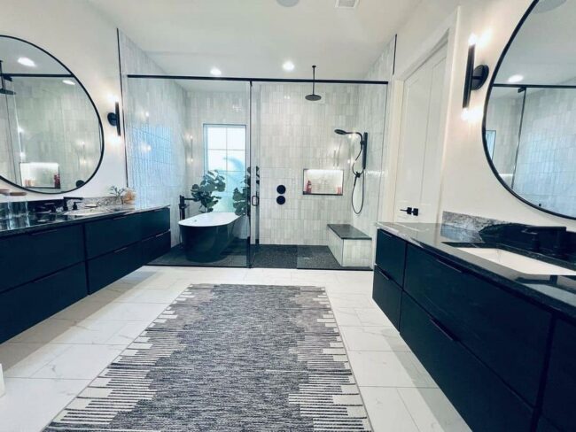 Modern bathrooms radiate elegance with gray vanities and bold black hardware that instantly draw you in.