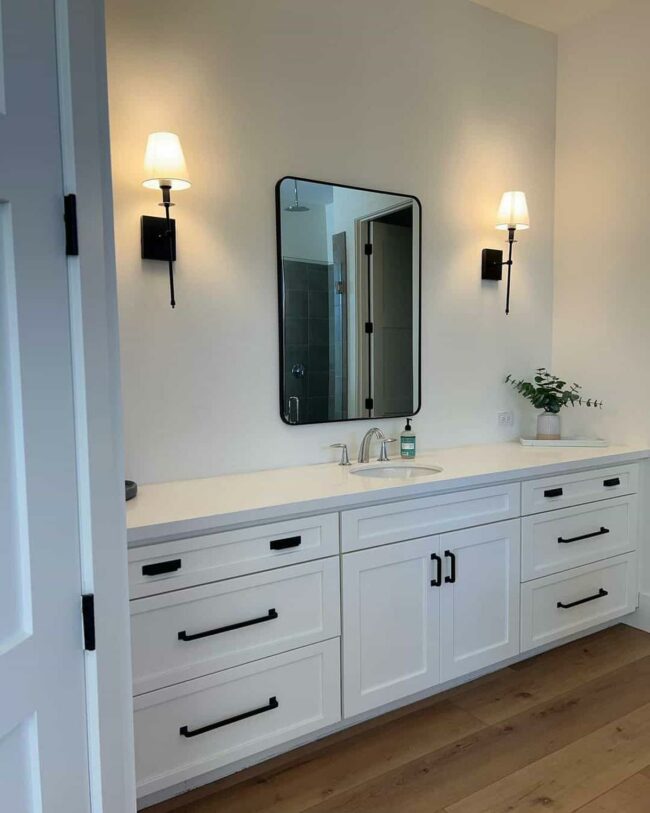 White vanity cabinetry with bold black hardware creates a sophisticated contrast against crisp surfaces.