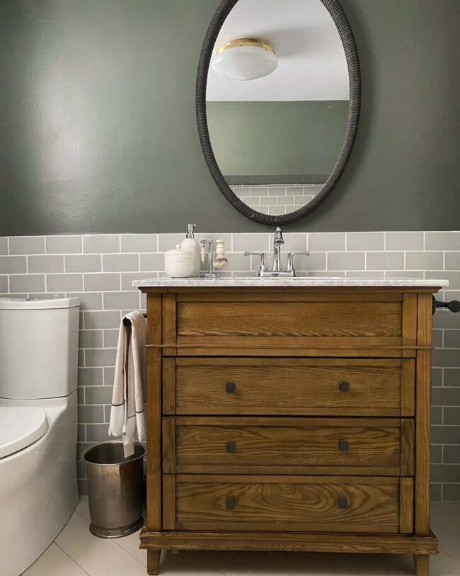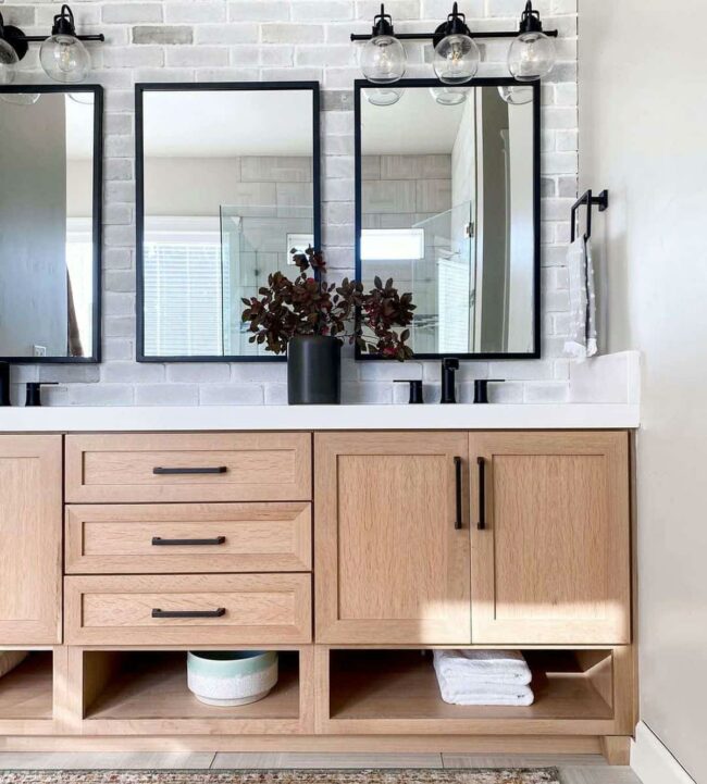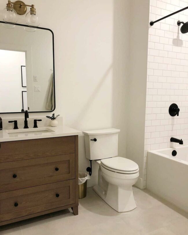 Wood vanities bring organic warmth, softening the overall aesthetic with their natural tones.