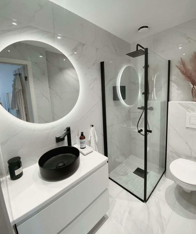 Black hardware and glass shower panels create dramatic visual contrast against crisp white surfaces.