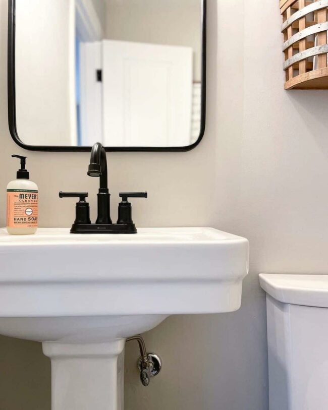 Smart design speaks volumes in this tiny bathroom where a bold black faucet contrasts dramatically against pristine white surfaces.