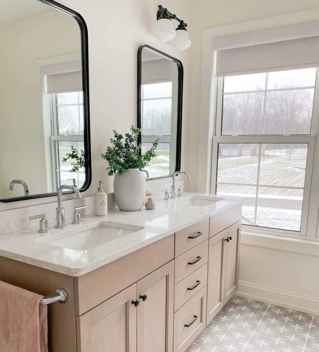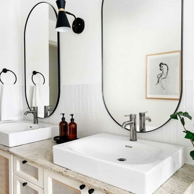 Rectangular mirrors flanked by matching vanity lights amplify the sense of balanced symmetry and refined elegance.