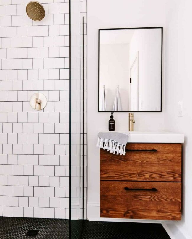 Classic square white tiles with black grout in the shower area highlight timeless elegance and functional beauty.