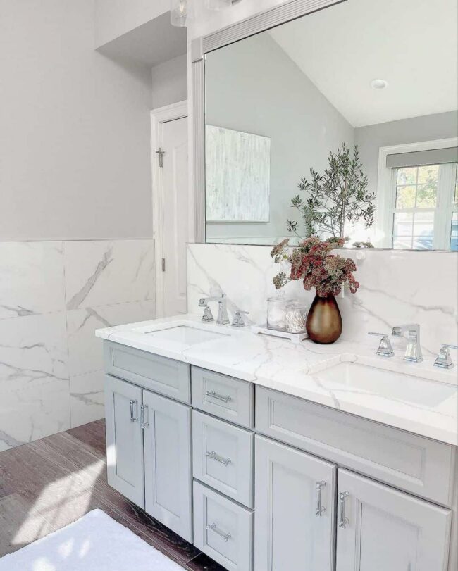 White marble countertops paired with light gray vanities create a sophisticated, serene sanctuary that feels both modern and timeless.