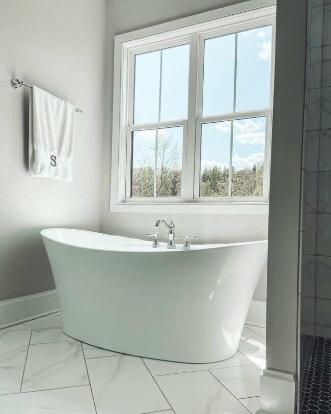 Sunlight illuminates the pristine white bathtub, creating a sanctuary of relaxation.