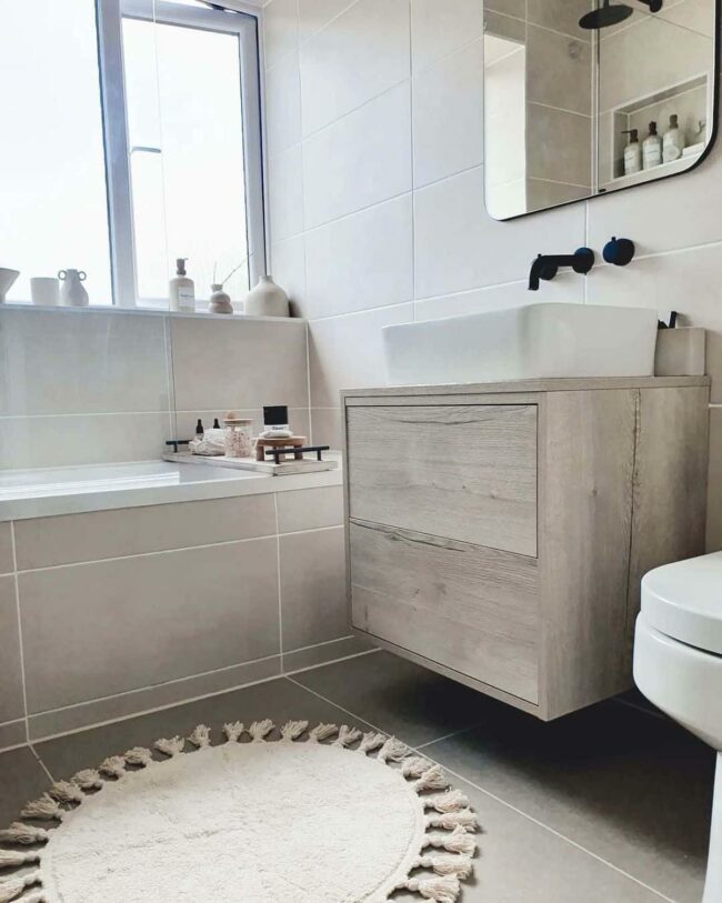 Rustic wood elements infuse warmth into a minimalist bathroom design, bringing natural charm to clean lines and modern surfaces.