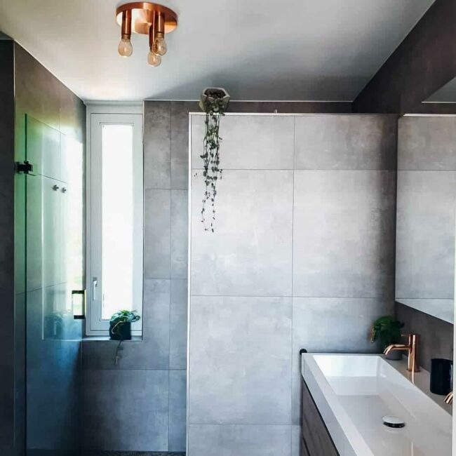Slate-gray bathroom tiles create a peaceful sanctuary that whispers calm and sophistication.