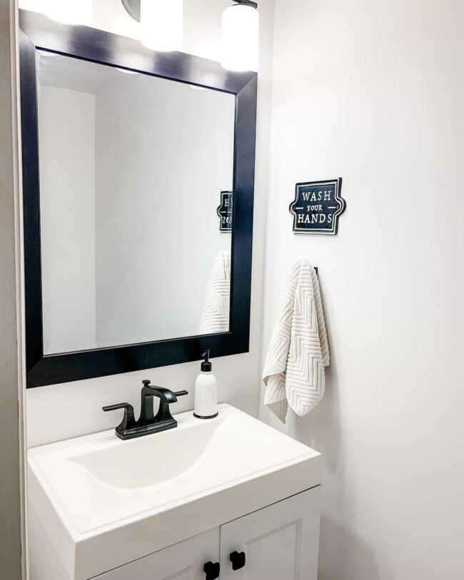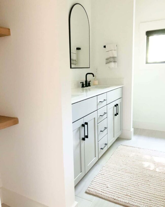 Black hardware adorns a sophisticated white vanity, adding a touch of modern refinement.
