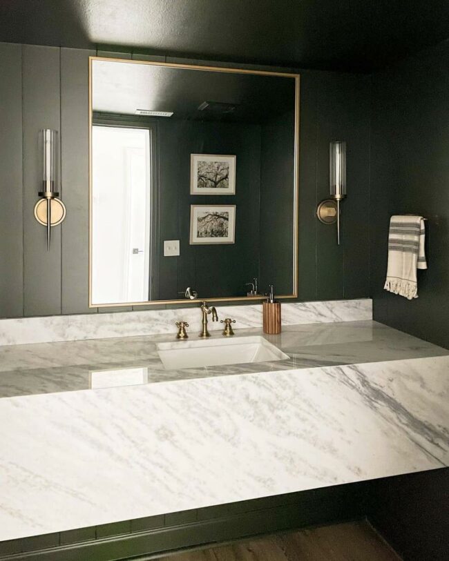 Elegant black vanity stands boldly against smooth gray marble countertops, anchoring the space with contemporary charm.