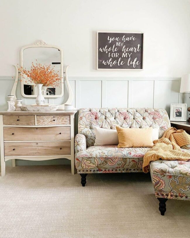Cream walls feature a charming board and batten design that adds architectural depth and visual interest.