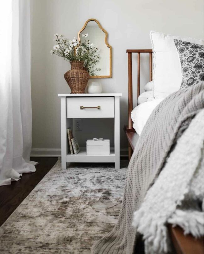Beautiful light dances through an arched mirror behind the nightstand, magically expanding the space and adding depth.