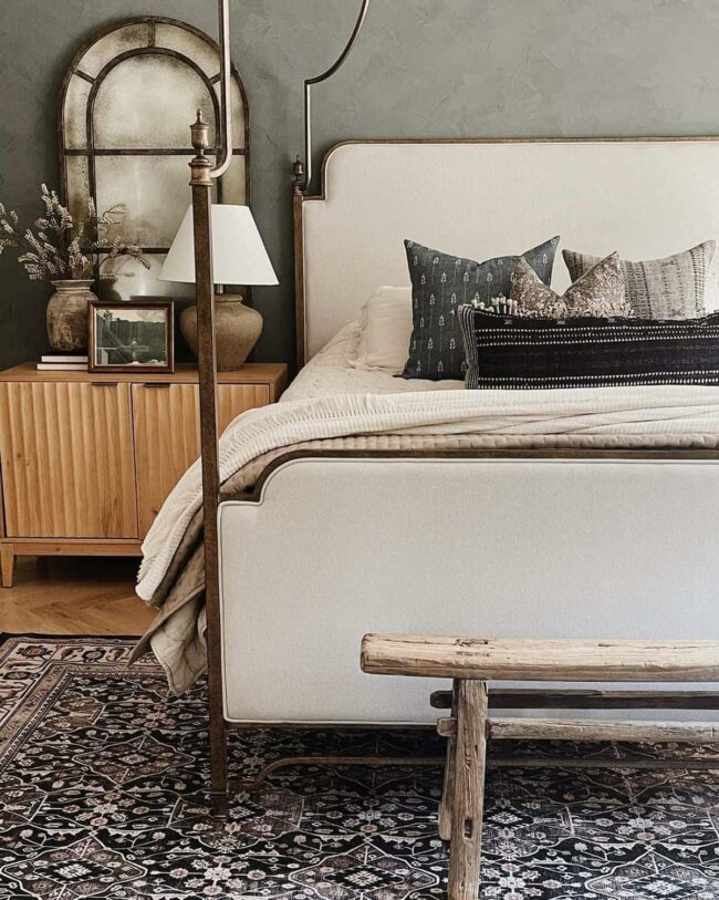 Arched rustic mirrors bring unexpected charm, strategically positioned behind nightstands to capture and bounce light beautifully.