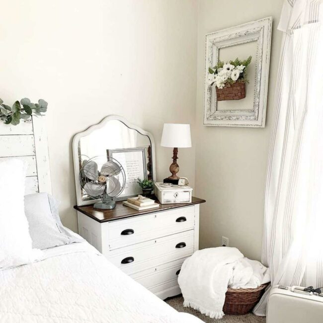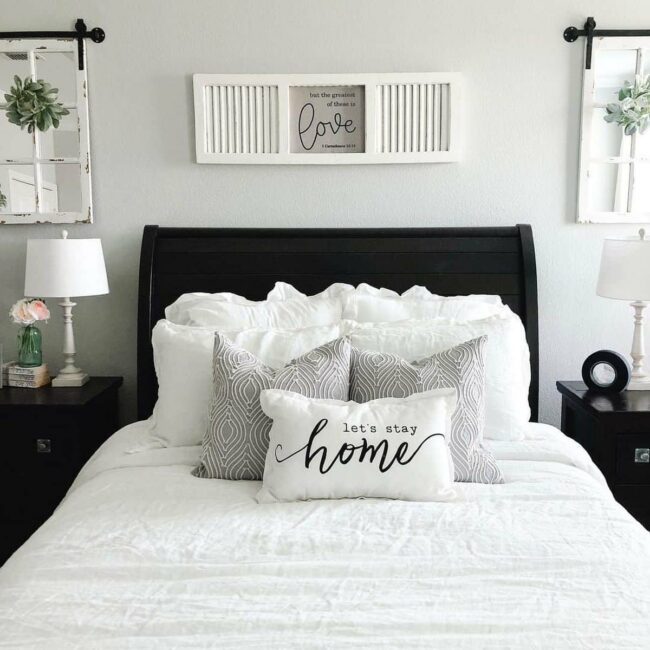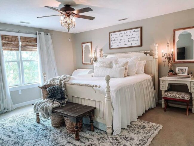 Crisp white farmhouse bed frame anchors the room with classic comfort.