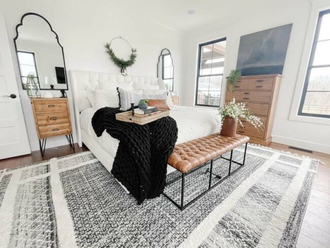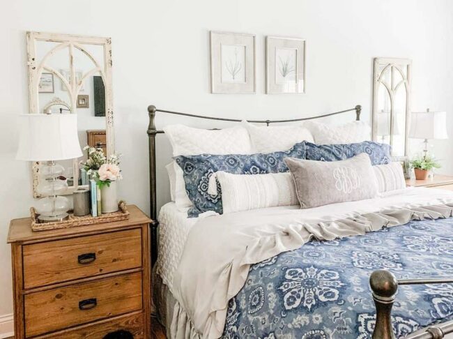 White farmhouse mirrors strategically placed behind wooden nightstands expand the room's sense of space and bounce light around beautifully.