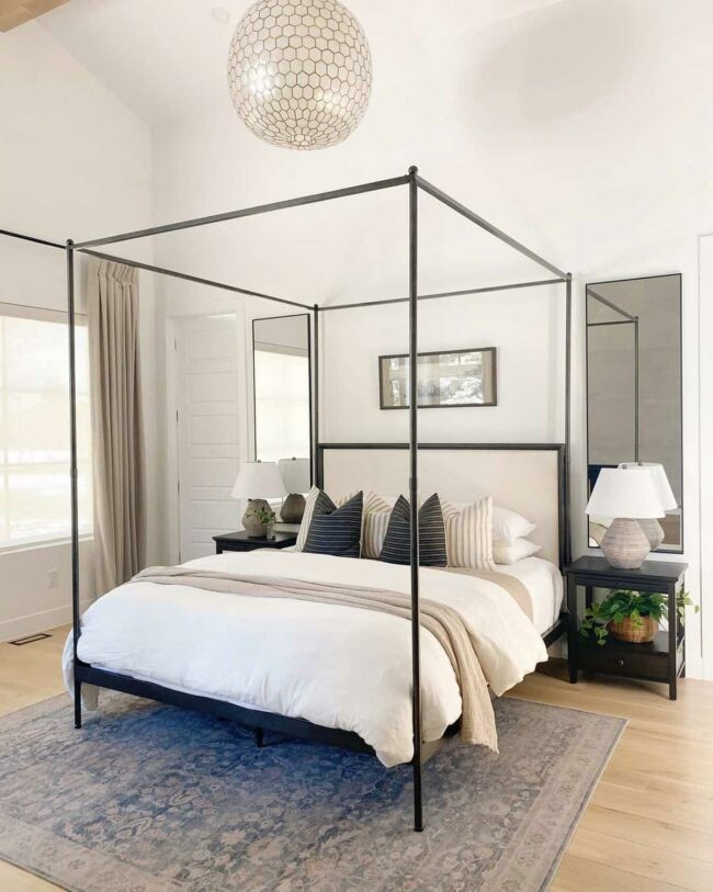 Arched mirrors above nightstands bounce delicate light across the room, expanding its sense of openness.