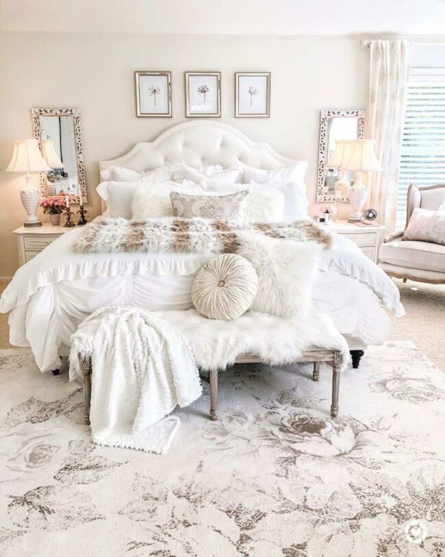 Crisp white bedding becomes a luxurious canvas for plush pillows and faux fur throws that promise comfort.