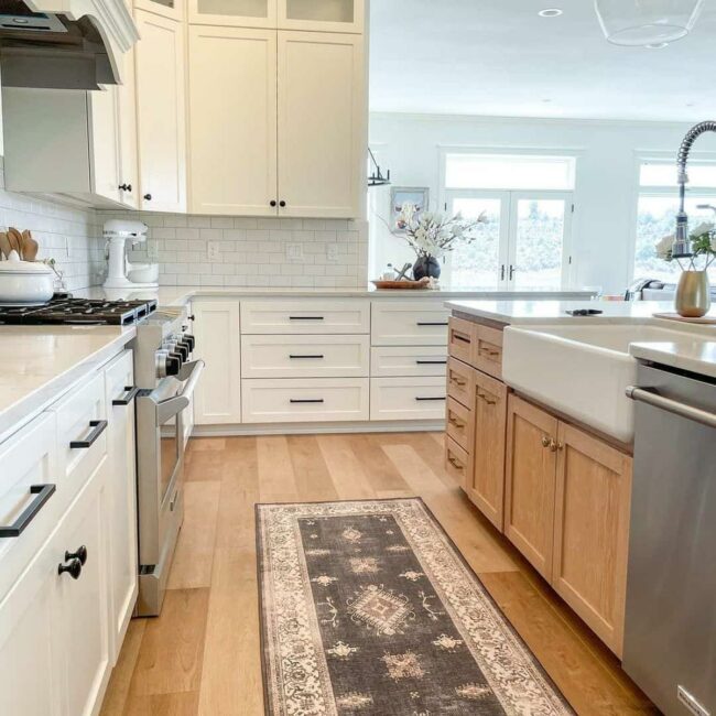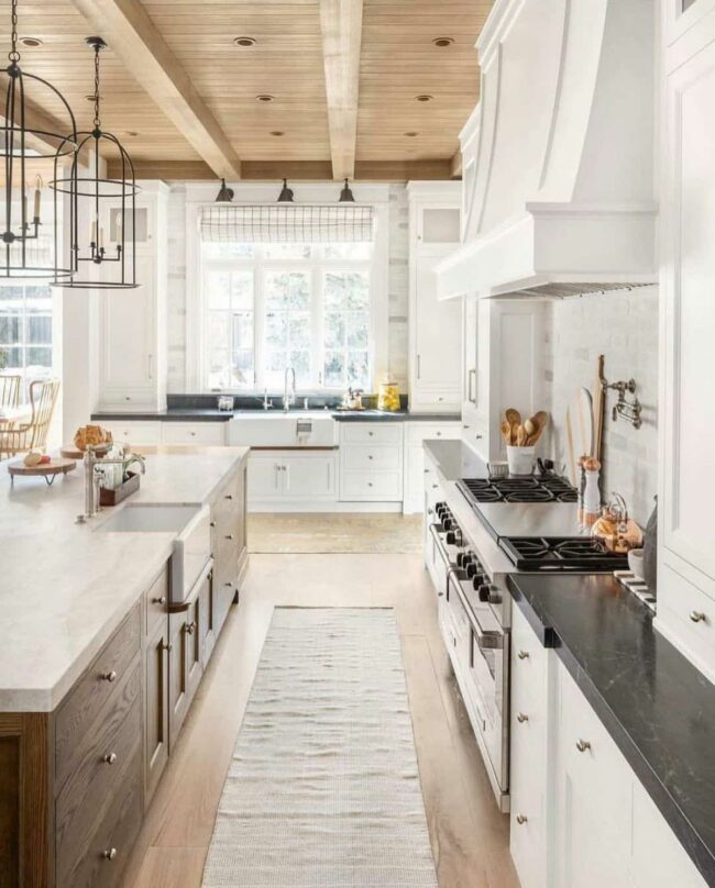 Kitchen design reaches new heights when wood islands blend seamlessly with white cabinets, creating an inviting sanctuary for cooking and gathering.