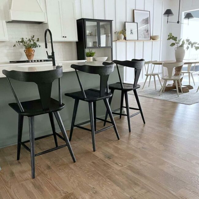 Black barstools introduce a dramatic contrast, adding depth and visual interest to the overall aesthetic.