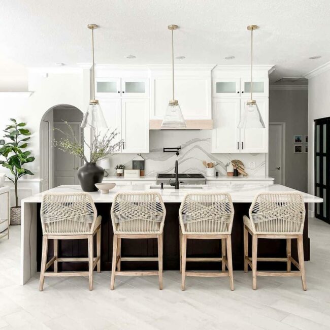 Black stools contrast elegantly against white accents, producing a balanced and sophisticated look.