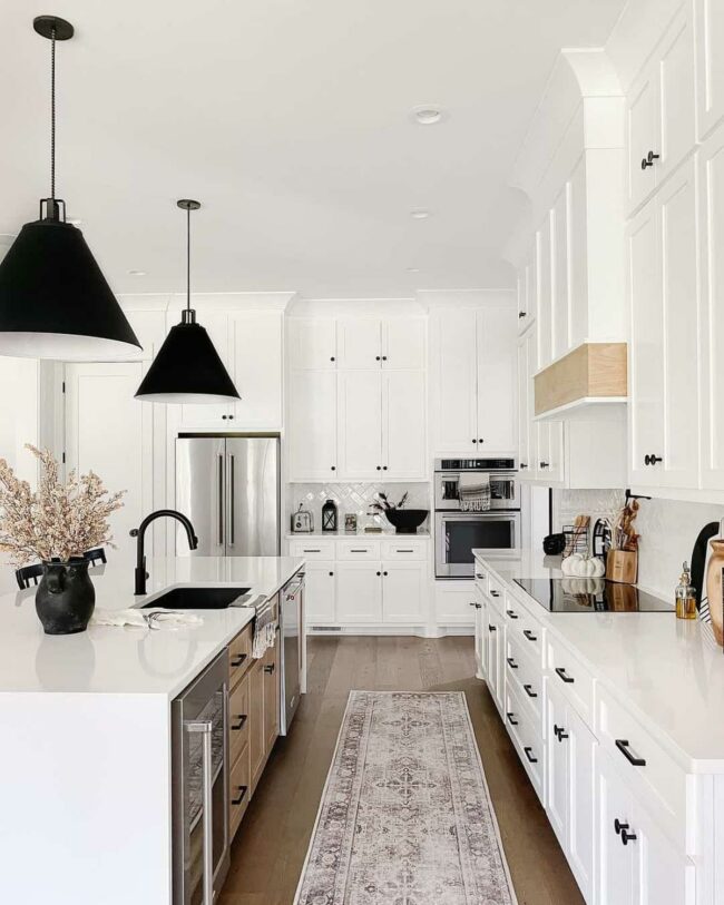 Black pendant lights and a dramatic island create bold visual anchors that balance sophisticated details.