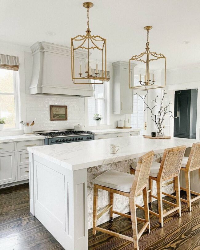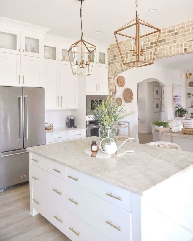 Gold cage pendant lights hang delicately, casting a gentle illumination across marble countertops.