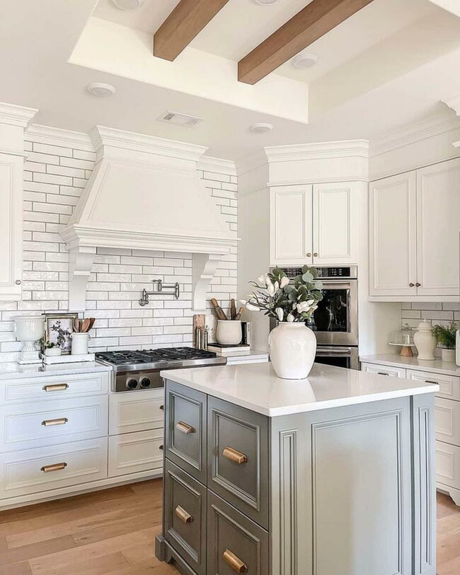 Bronze accents and natural wood beams complement the island's understated elegance, transforming mundane cooking areas into charming gathering spots.