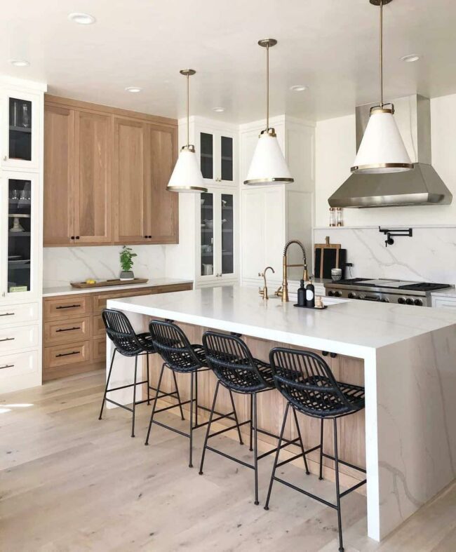 Marble waterfall countertops create a stunning focal point that draws immediate attention.