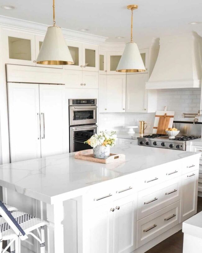 White cabinetry frames the centerpiece, creating a stunning neutral backdrop for daily life.