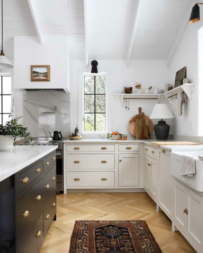 Crisp white farmhouse sinks anchor the design, connecting different zones with elegant simplicity.