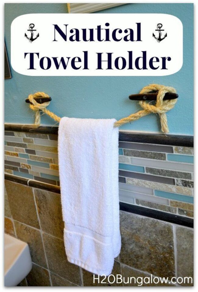 Elevate your bathroom's charm with a rustic hanging shelf that blends nautical vibes and smart storage solutions.