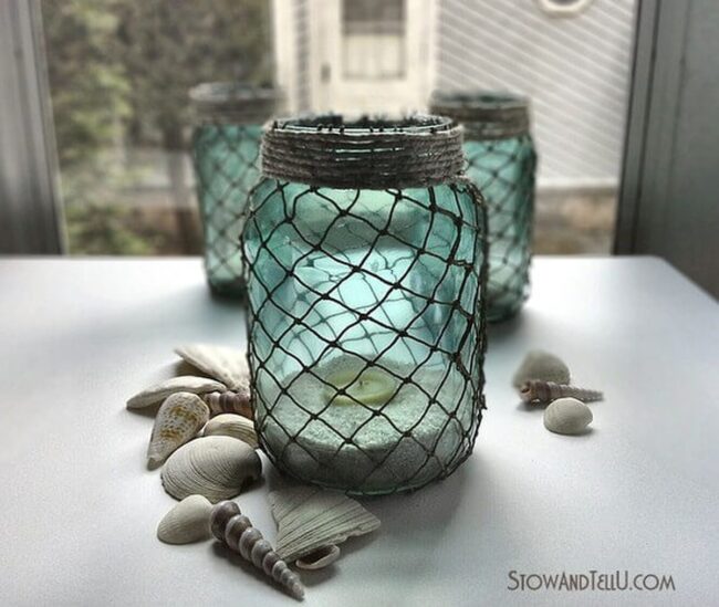 Mason jar tea light holders bring coastal charm to any space with their rustic maritime appeal.
