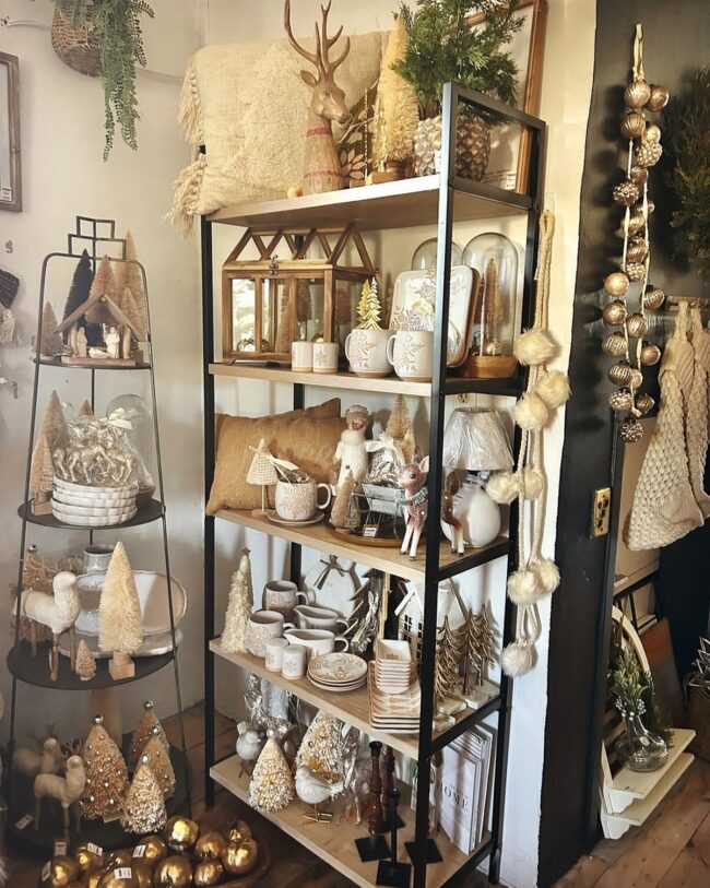 Holiday shelf decor shines when vintage charm meets modern elegance, creating a captivating display that draws the eye and sparks curiosity.