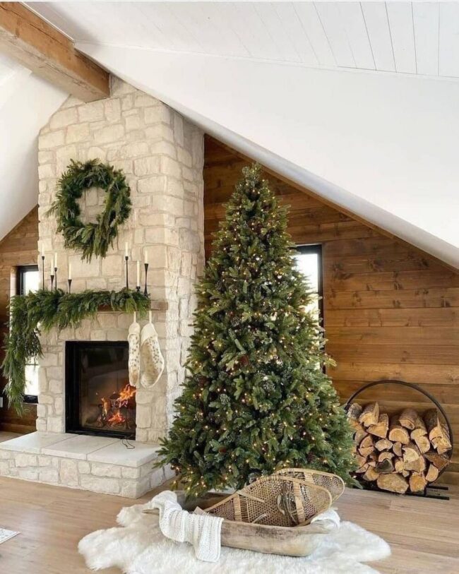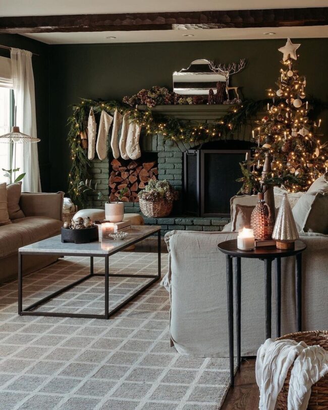Rich green and gold ornaments complement the rustic texture, creating sophisticated seasonal ambiance without visual chaos.