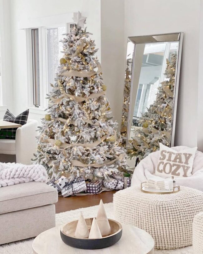 Silver ornaments strategically placed catch light, adding delicate sparkle against neutral living spaces.