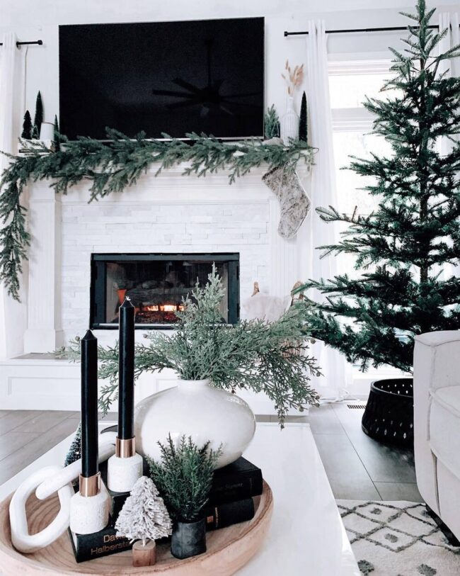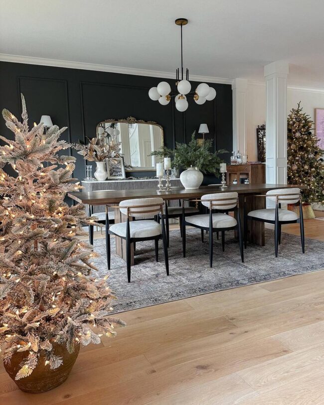 Holiday decorating embraces modern design with sophisticated charm, blending dark and light elements to craft an inviting seasonal space.
