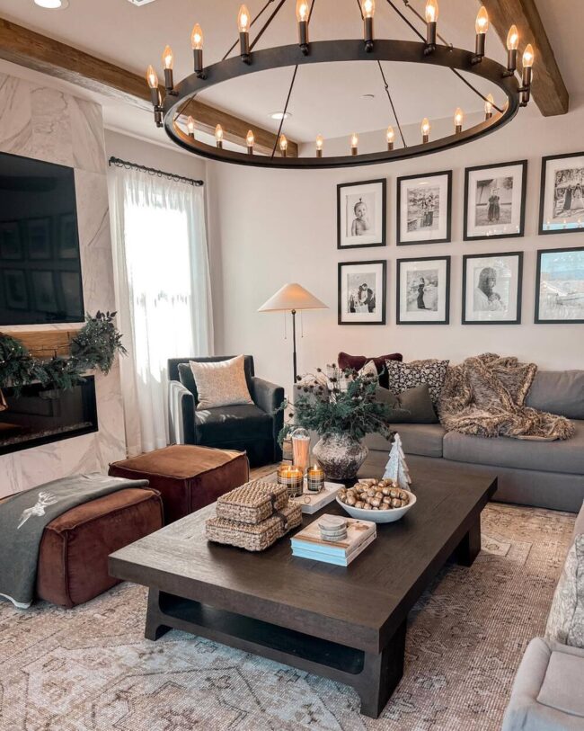 Strategic wooden accents on mantles, mirror frames, and furniture provide visual depth and character to the room's overall aesthetic.