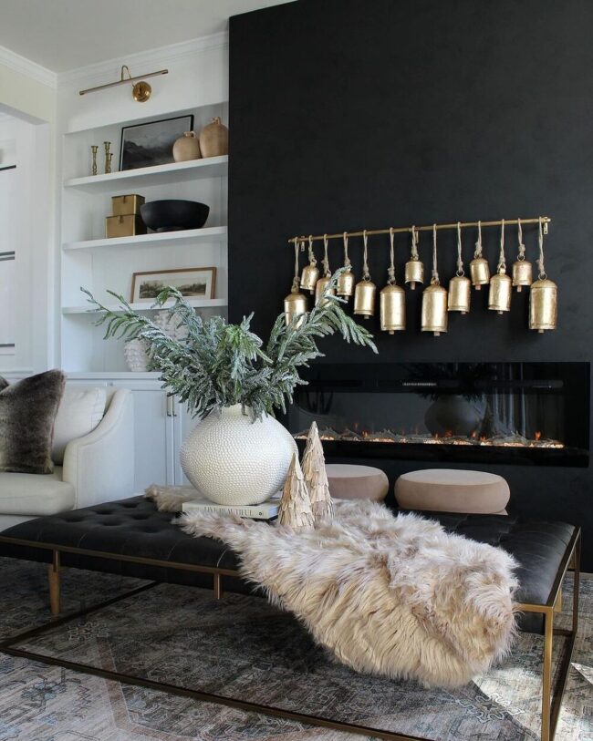 Matte black fireplaces become stunning focal points when adorned with shimmering golden bells against pristine white walls, creating visual intrigue that captivates the eye.