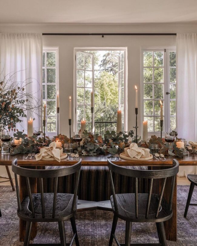 Delicate leaf garlands draped across table runners create visual interest and seasonal harmony.