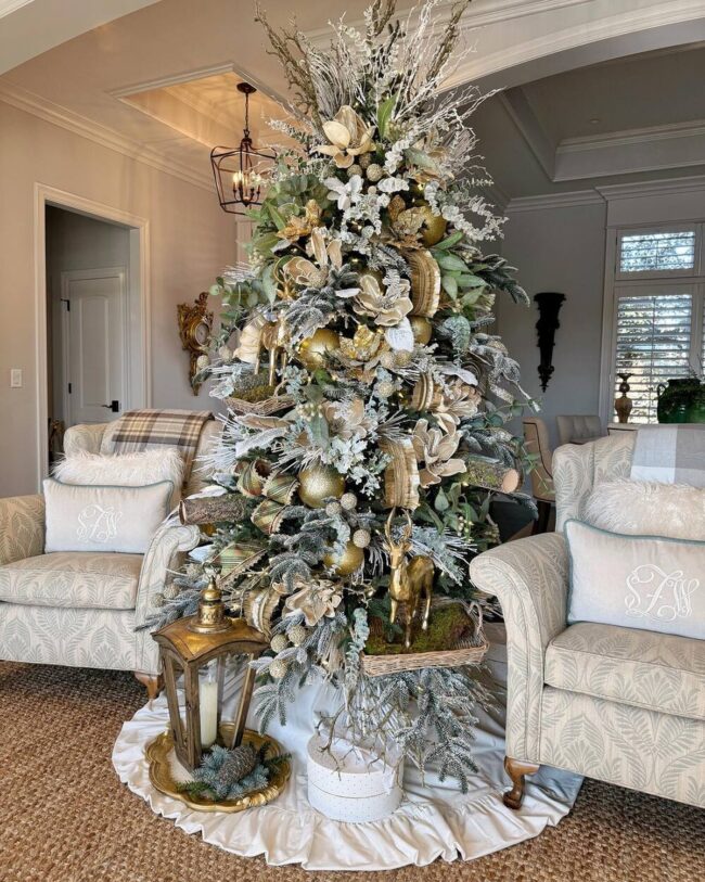 Metallic golden reindeer figurines nestled at the tree's base introduce an enchanting woodland charm to the scene.