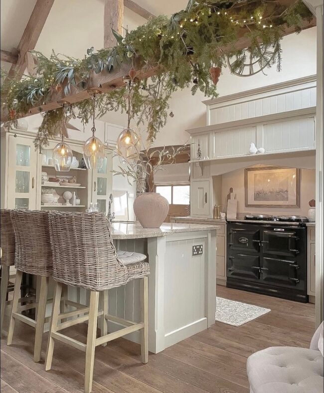 Lush greenery garlands draped across countertops and adorned with twinkling lights create an enchanting atmosphere that beckons warmth and connection.