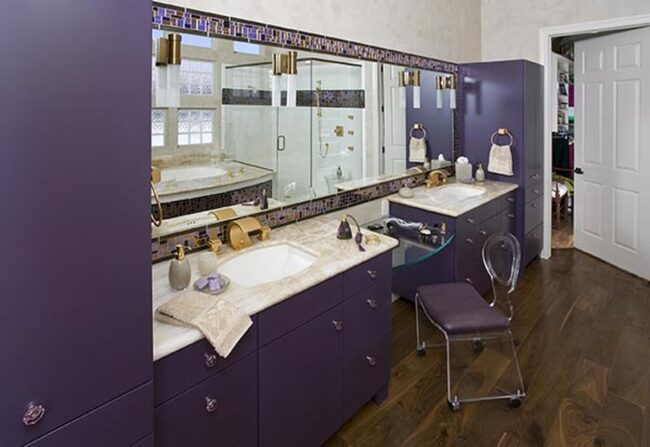 Purple bathroom vanities elevate ordinary spaces with dramatic visual impact, introducing unexpected elegance into home design.