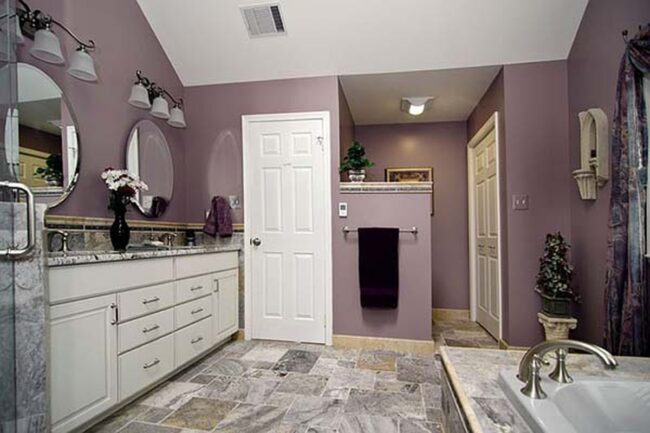 Lavender-hued bathroom spaces radiate elegance and calm, offering a sophisticated sanctuary for personal rejuvenation.