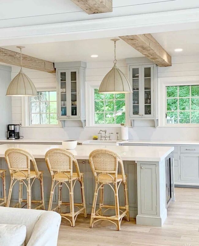 Pristine white countertops crown a spacious island where rattan bar stools beckon you to relax and enjoy casual meals.