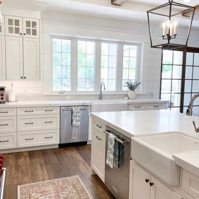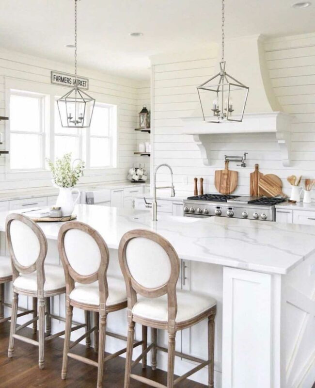 White shiplap walls in this kitchen create an airy sanctuary with clean lines and open vibes.