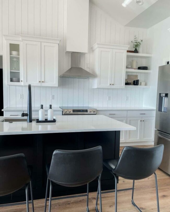 White vertical shiplap dominates the kitchen, creating a captivating backdrop that instantly elevates the space.