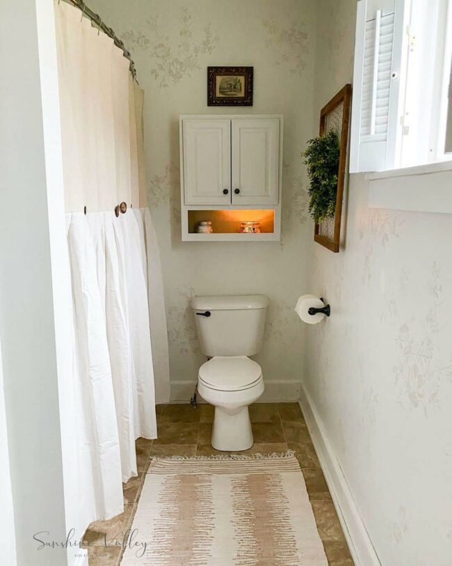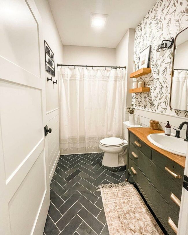 Delicate wallpaper patterns whisper countryside elegance across bathroom walls, creating a soothing visual landscape.