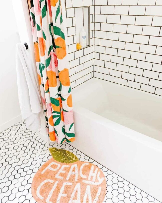 Playful peach patterns cascade across the shower curtain, beautifully echoed by a coordinating bath mat that anchors the design.