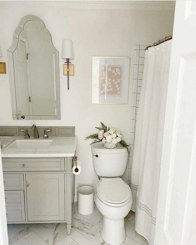 Brass sconces beautifully frame an arched mirror, creating instant sophistication in this bathroom design.