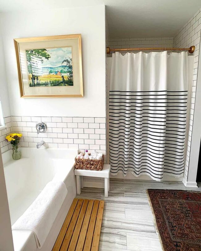 Horizontal striped curtains add playful movement around the shower area, softening the room's structured aesthetic.